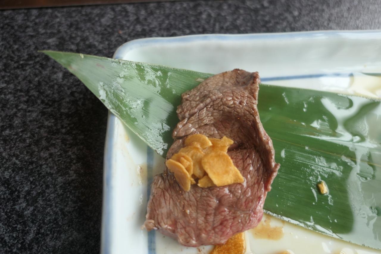 焼いた肉にガーリックスライスを載せて食べます。肉が柔らかく旨い。