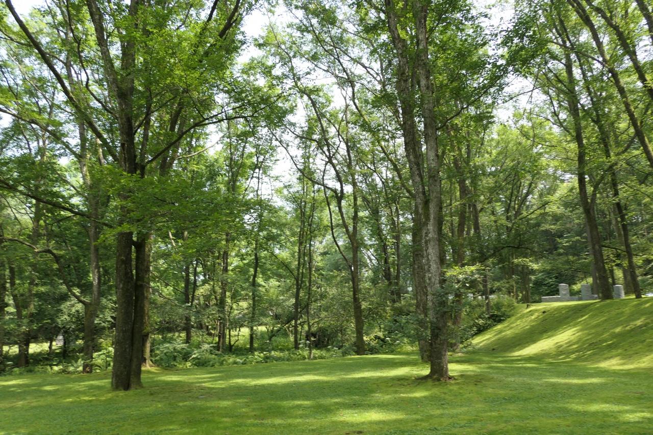苔むした緑の絨毯、落葉樹の大木、鳥のさえずり、ひっそりと咲くウバユリ。