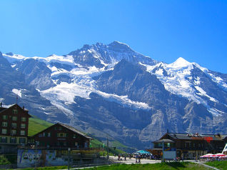 振り返るとユングフラウの山並みが美しく見えます。あの肩越しのところがスフィンクステラスで、その直下がユングフラウヨッホ駅でしょう。今更ながら凄いところに鉄道を敷設したものです。