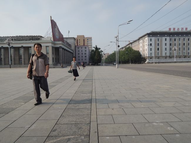 巨大な建造物が立ち並ぶ金日成広場を通勤する人が行きかう。