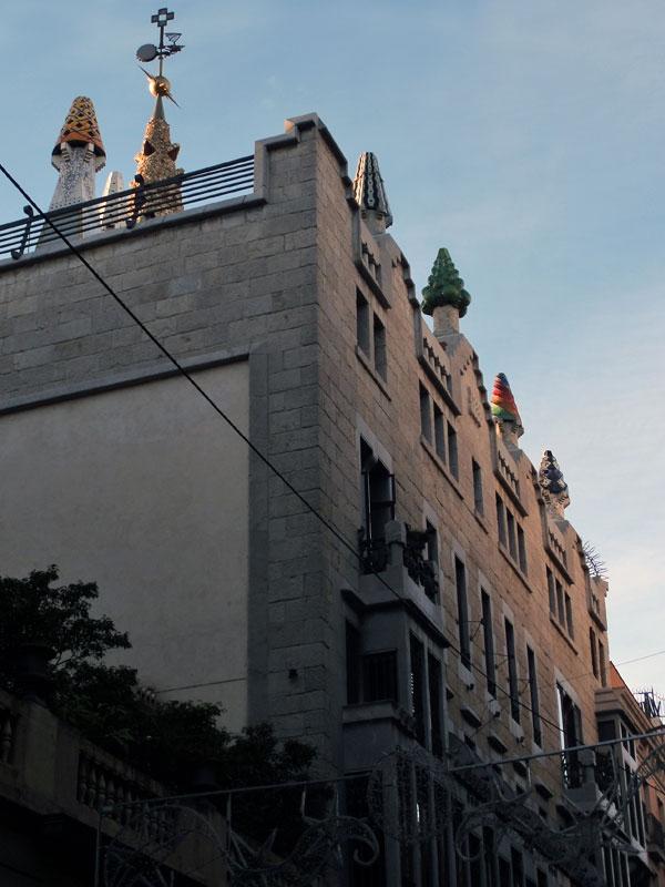 ランブラス通りを戻ります。オペラ座のリセウ大劇場より1本手前の路地をラバル地区に入ったところにある、屋上に奇妙なキノコが並ぶ建物は、ガウディーが手掛けたグエル邸。