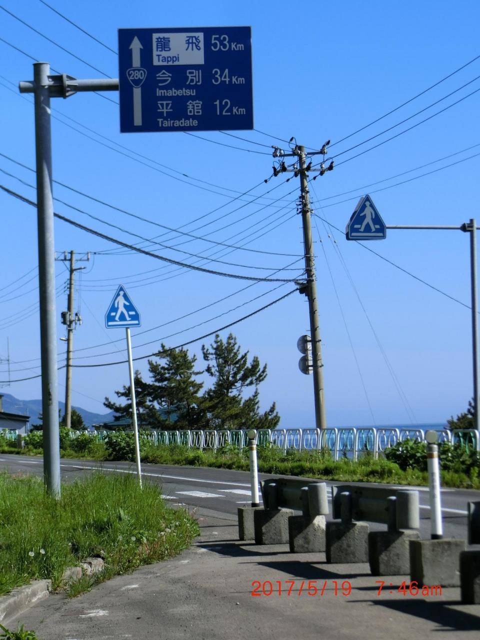 山から下りて街道に復帰する。道路標識は龍飛53km、今別34km、平館迄