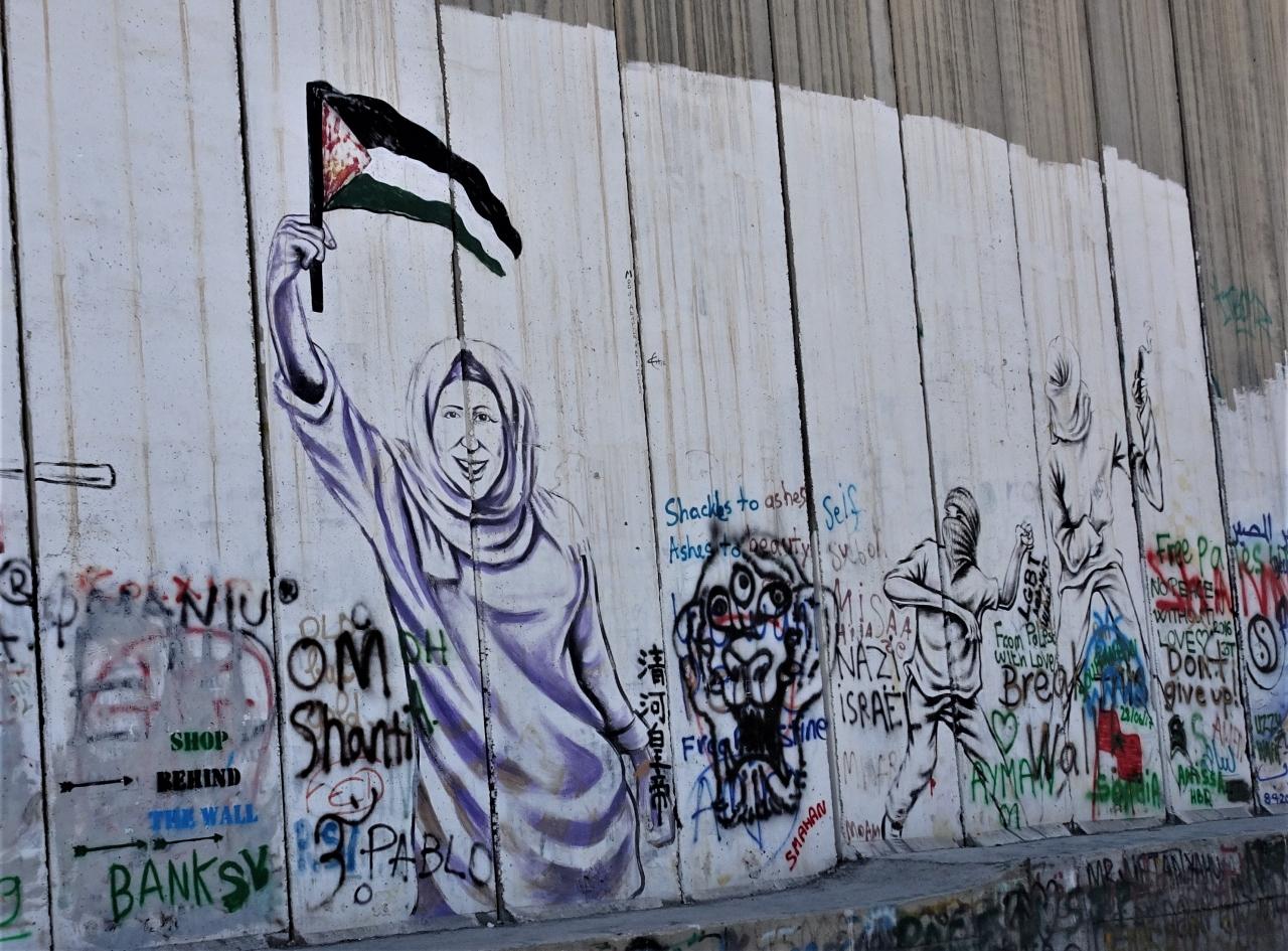 パレスチナの旗を掲げたムスリム女性に向けて左側からイスラエル兵が銃を構え、右側からはパレスチナ兵が投石で応戦するという画。 -