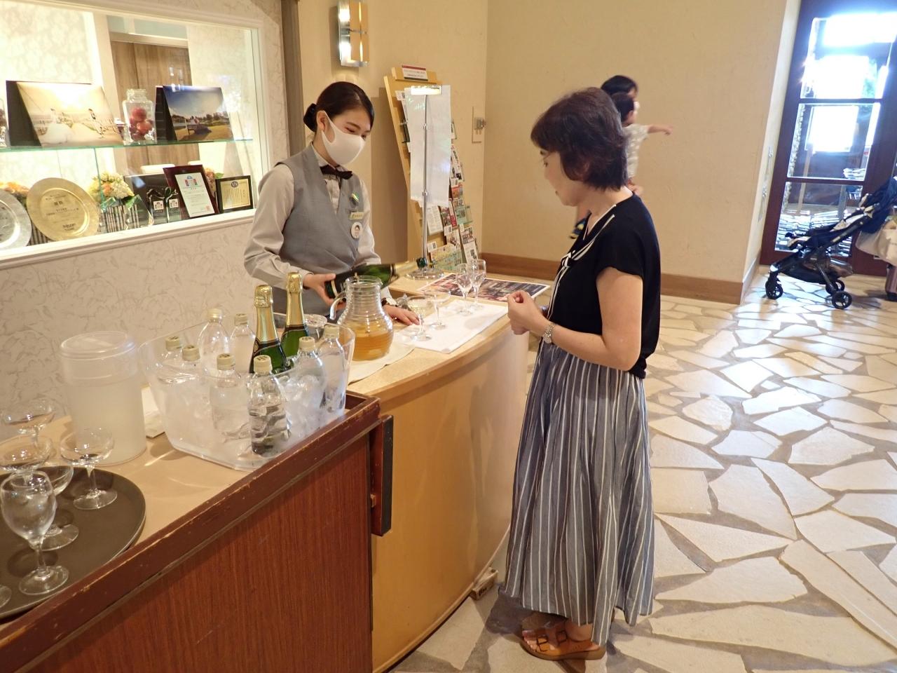 駅までの送りのバスを待つ間、シャンパンのサービスが。 -