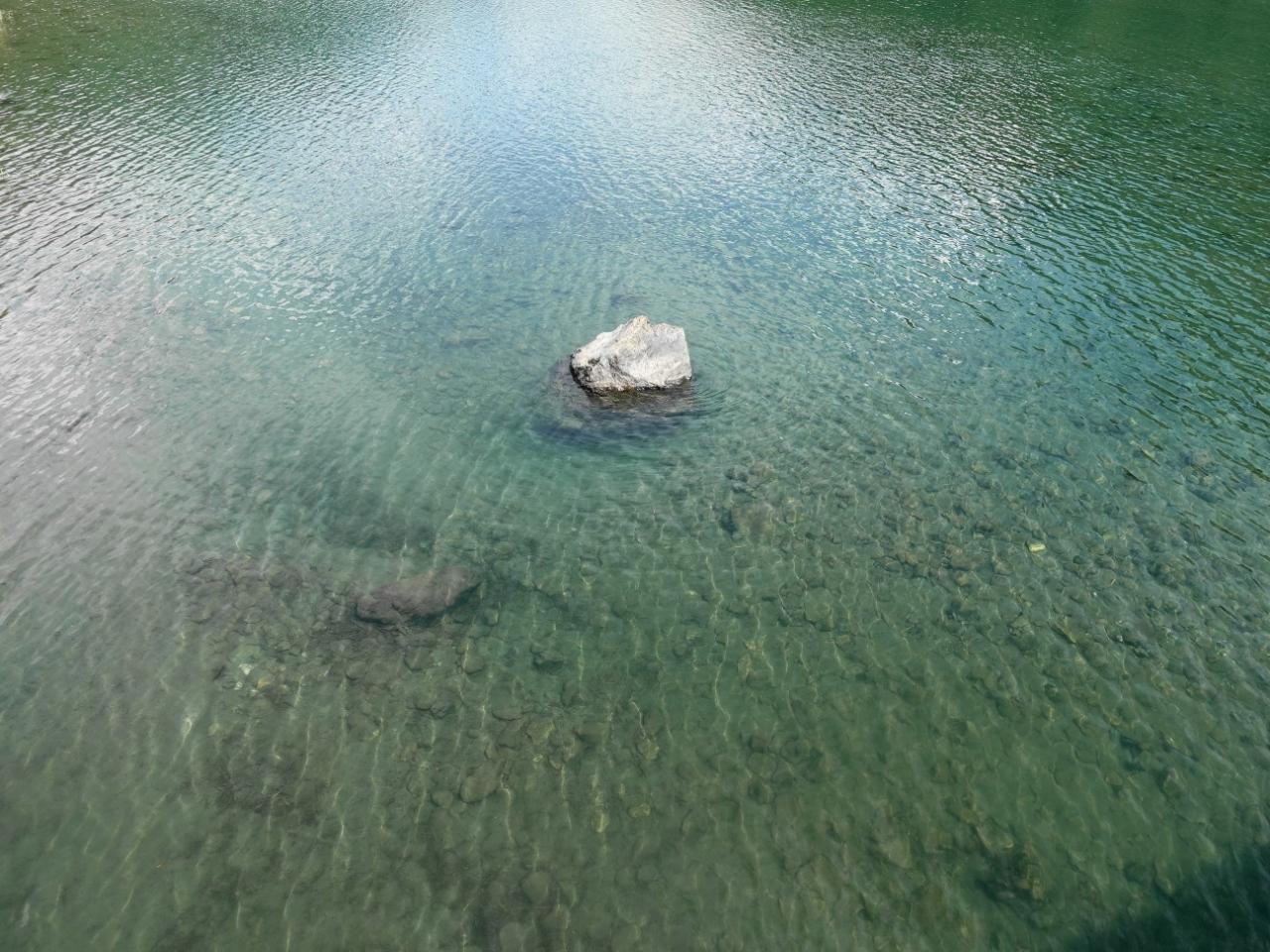 水が綺麗。かなり下流なのに透き通っています。このあたりはブルーというよりグリーンですね。 -