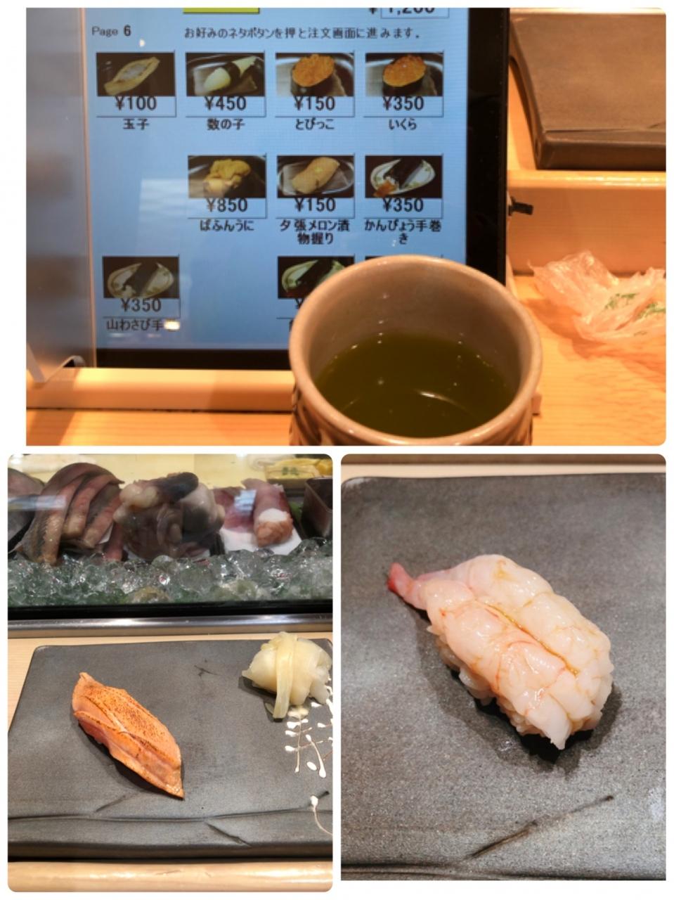 カウンターに案内され、ここのシステムを聞き、タッチパネルでネタと金額を確認。私がチョイスしたのは、炙りサーモン。脂がいい具合で口の中でとろけていき、余韻に浸っていました。そして甘エビ。ほんまに甘く、これまた口の中でとけていきました。