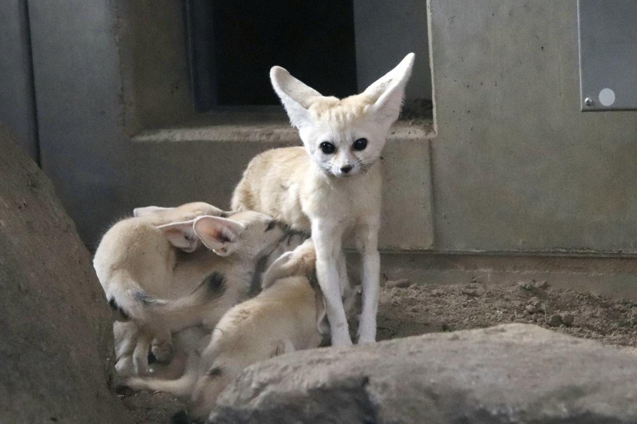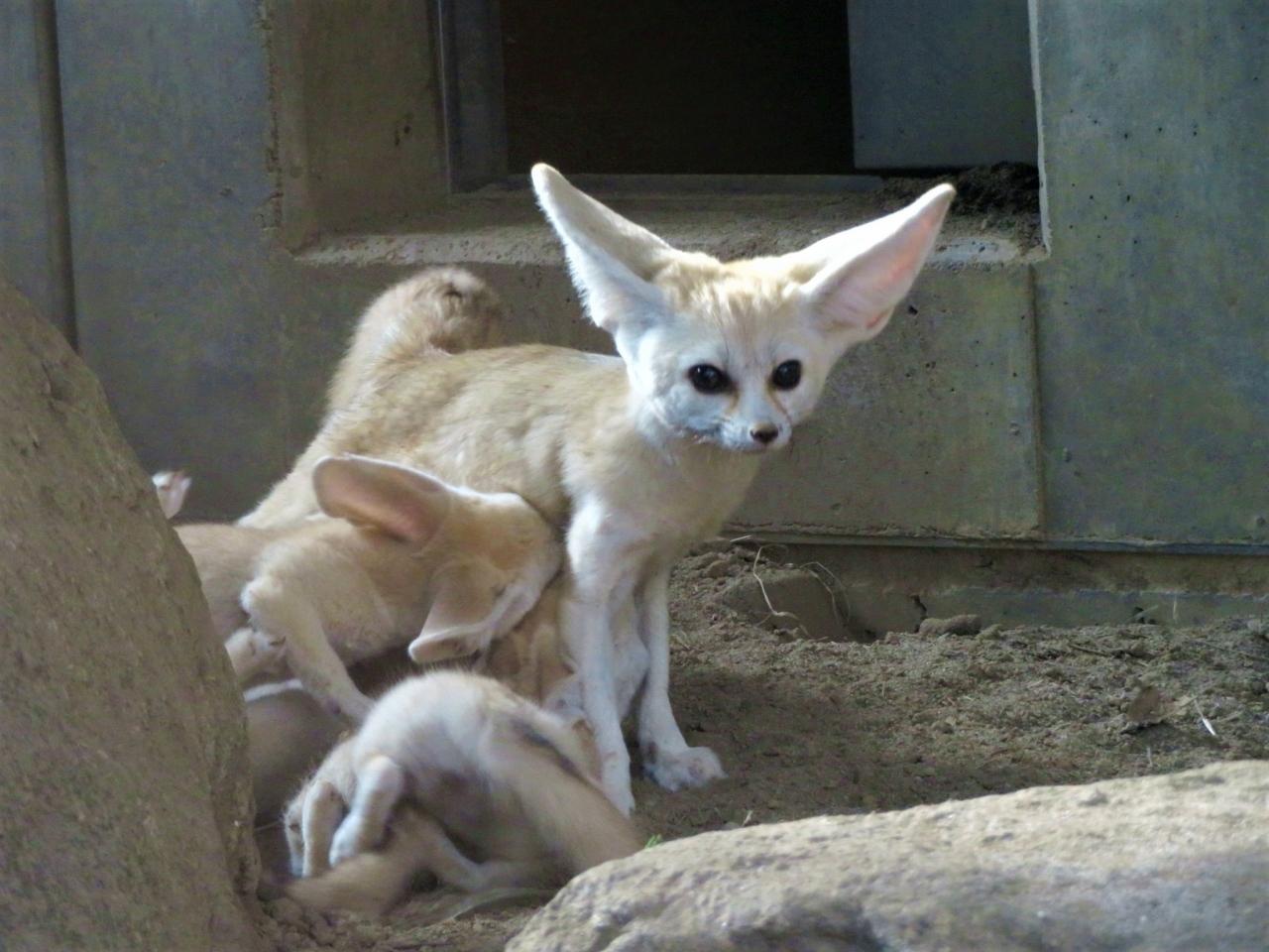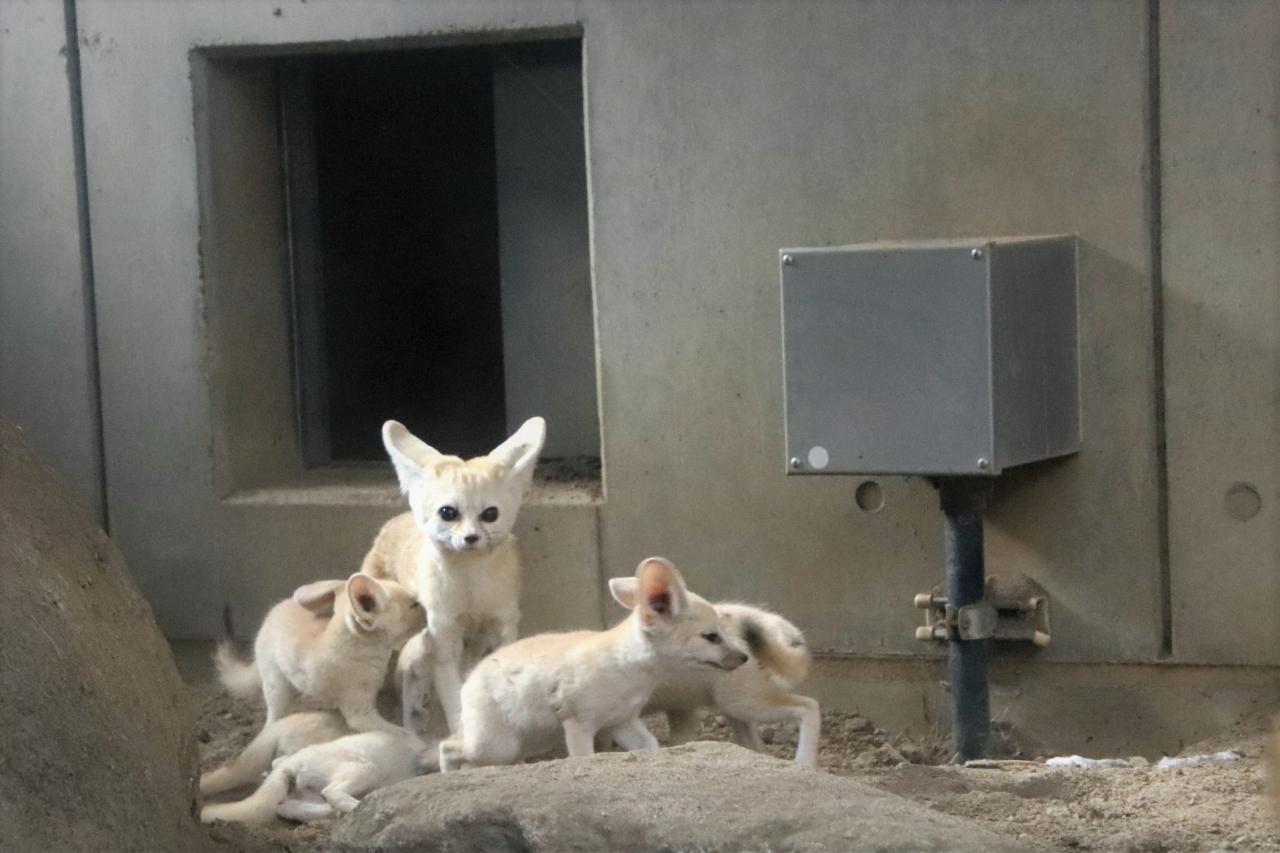 前回もそうだったのですが、この時間は飼育員さんが来ていて、フェネックたちに夕ご飯をあげた直後だったらしく、フェネックたちはお昼寝から起きていて、巣穴から出入りする赤ちゃんの姿もちらほら見られました。
