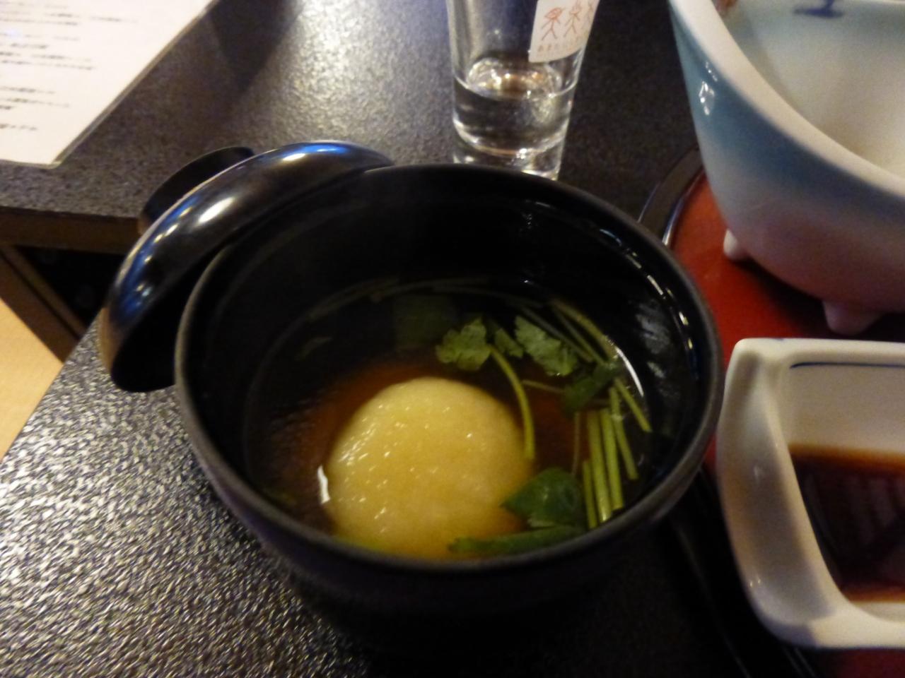 石焼料理はかなりの高温の為、普通のお椀だと熱くて持てないので、木桶の椀で提供されるのだそうです。 -