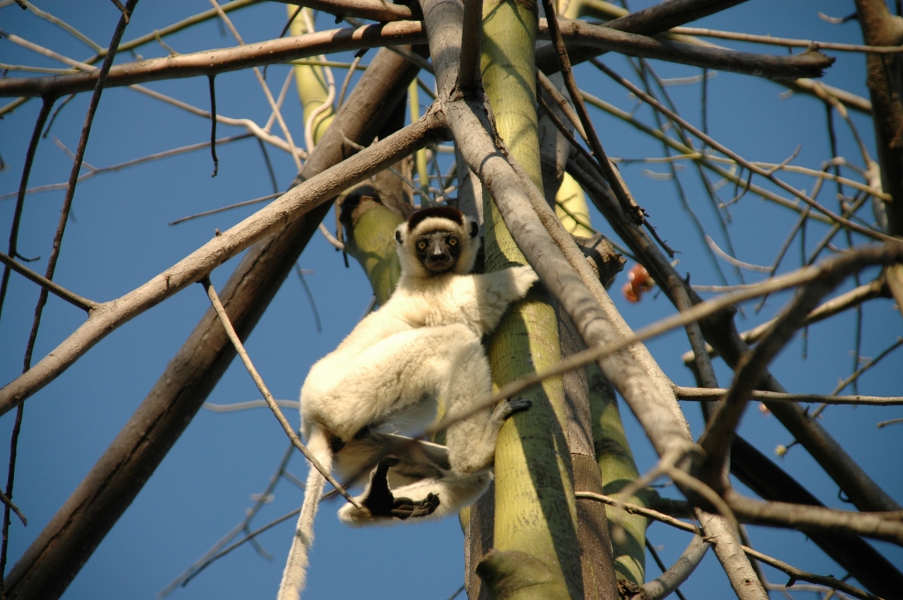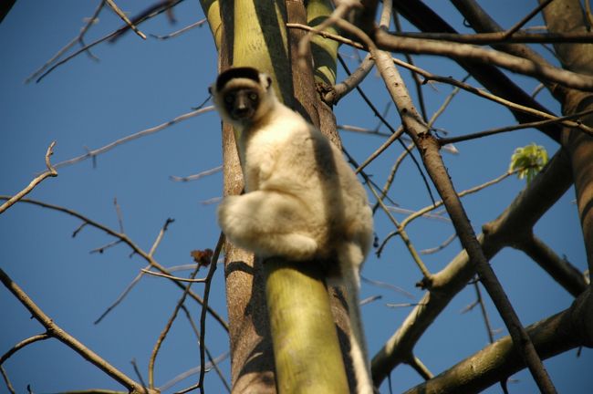 まずはメナベ公園に向かい横っ飛びで有名なベローシファカを見ることにしたのですが、残念ながら木の上にいる姿しか見学できませんでした。 -