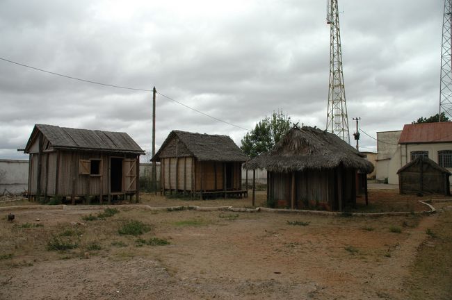 初代首相官邸跡のうらにマダガスカルの地方別に民家の建築様式が展示されていた。地面の枠は地図です。