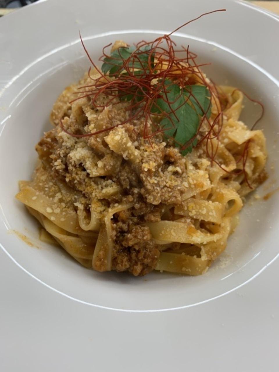 衣料の原本と一緒に食べるが、ミートソース飛ばないか。ヒヤヒヤ -