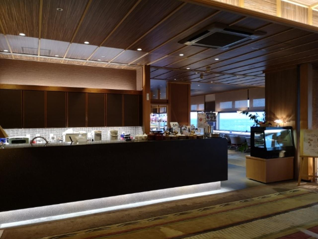 ロビー。 生憎の雨模様。 晴れていたらさぞや美しい海の景色でしょう。