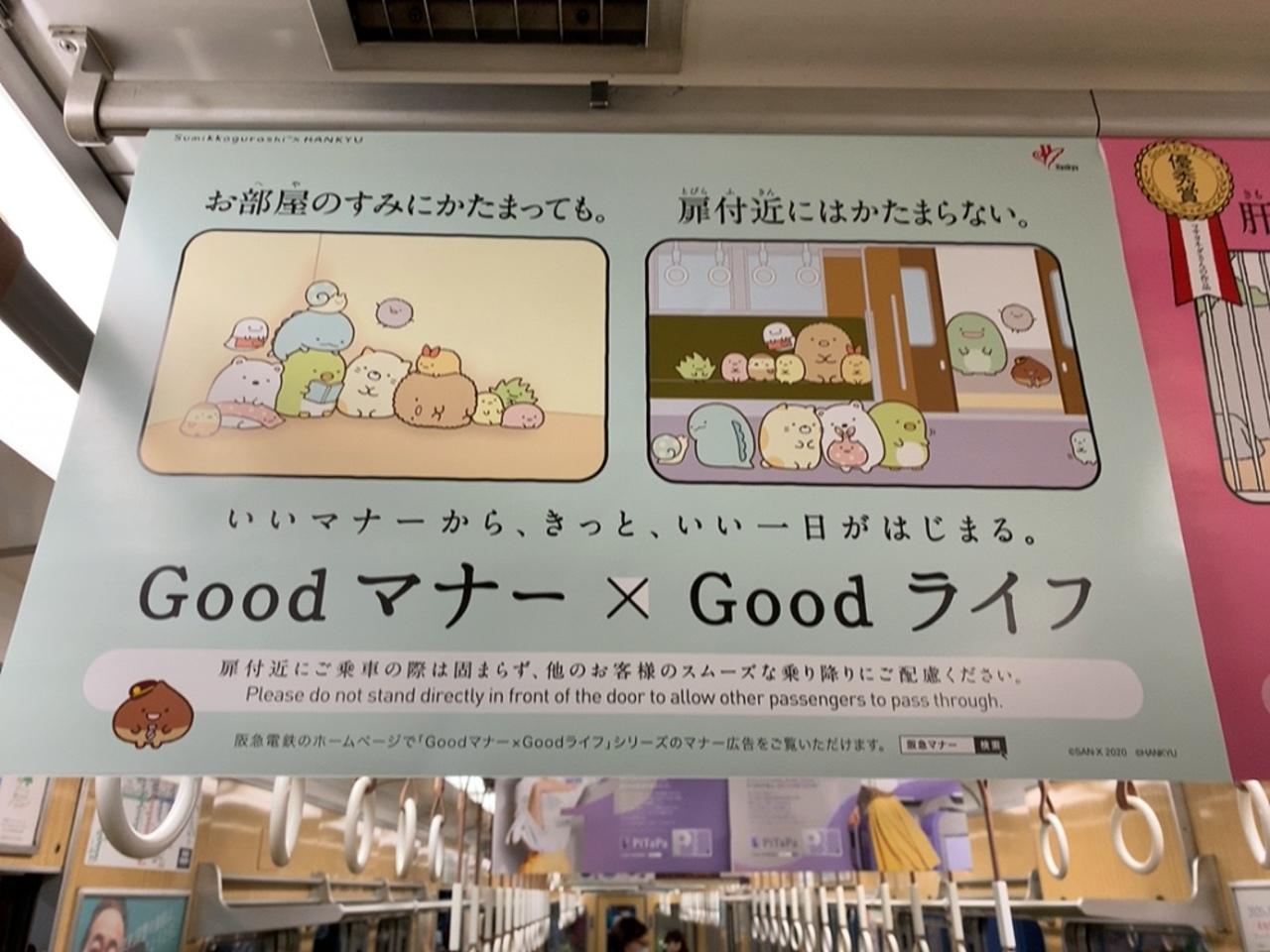 特別ラッピング電車じゃなくても、車内にはすみっコぐらしの広告の中吊りがあったり・・・。