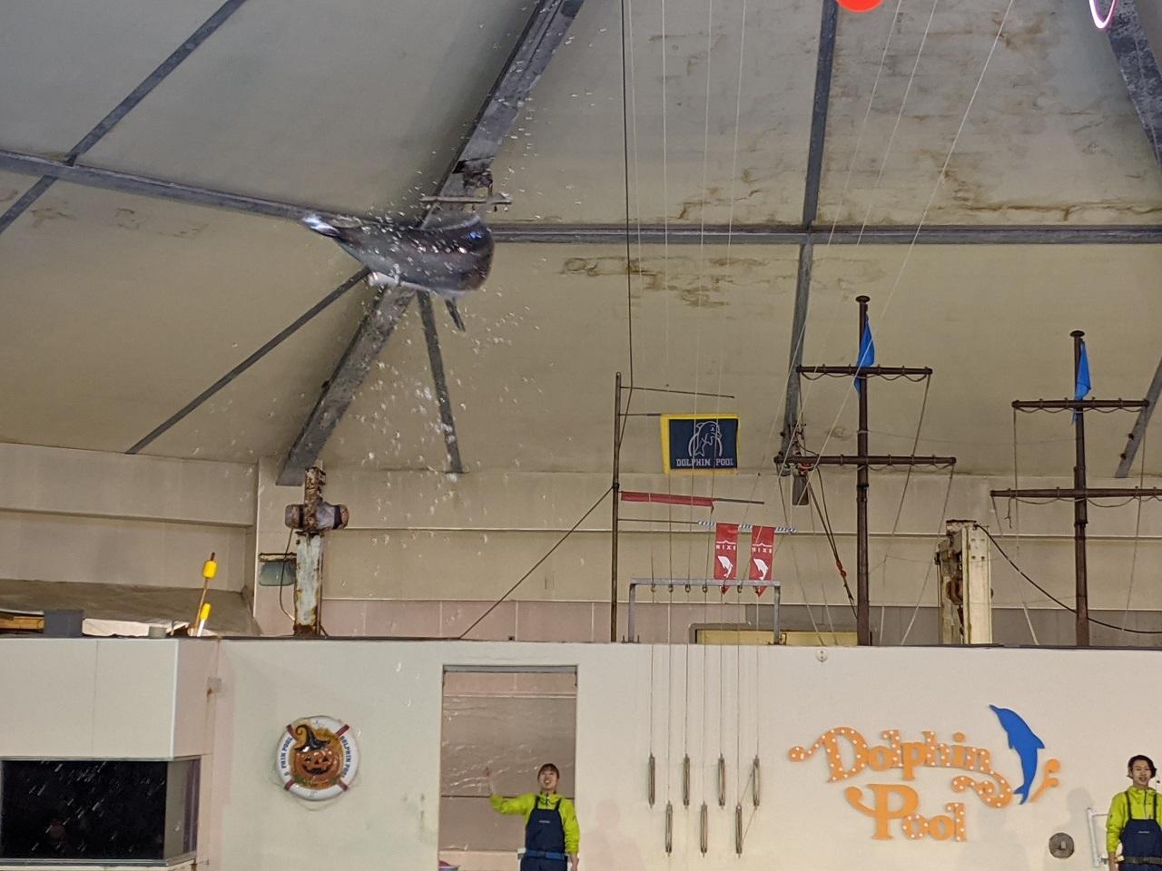 イルカショーの時間です。まずは、天井まで高くジャンプ!