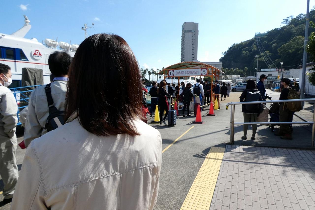 熱海港船客待合所のアナウンスで乗船口に並びます