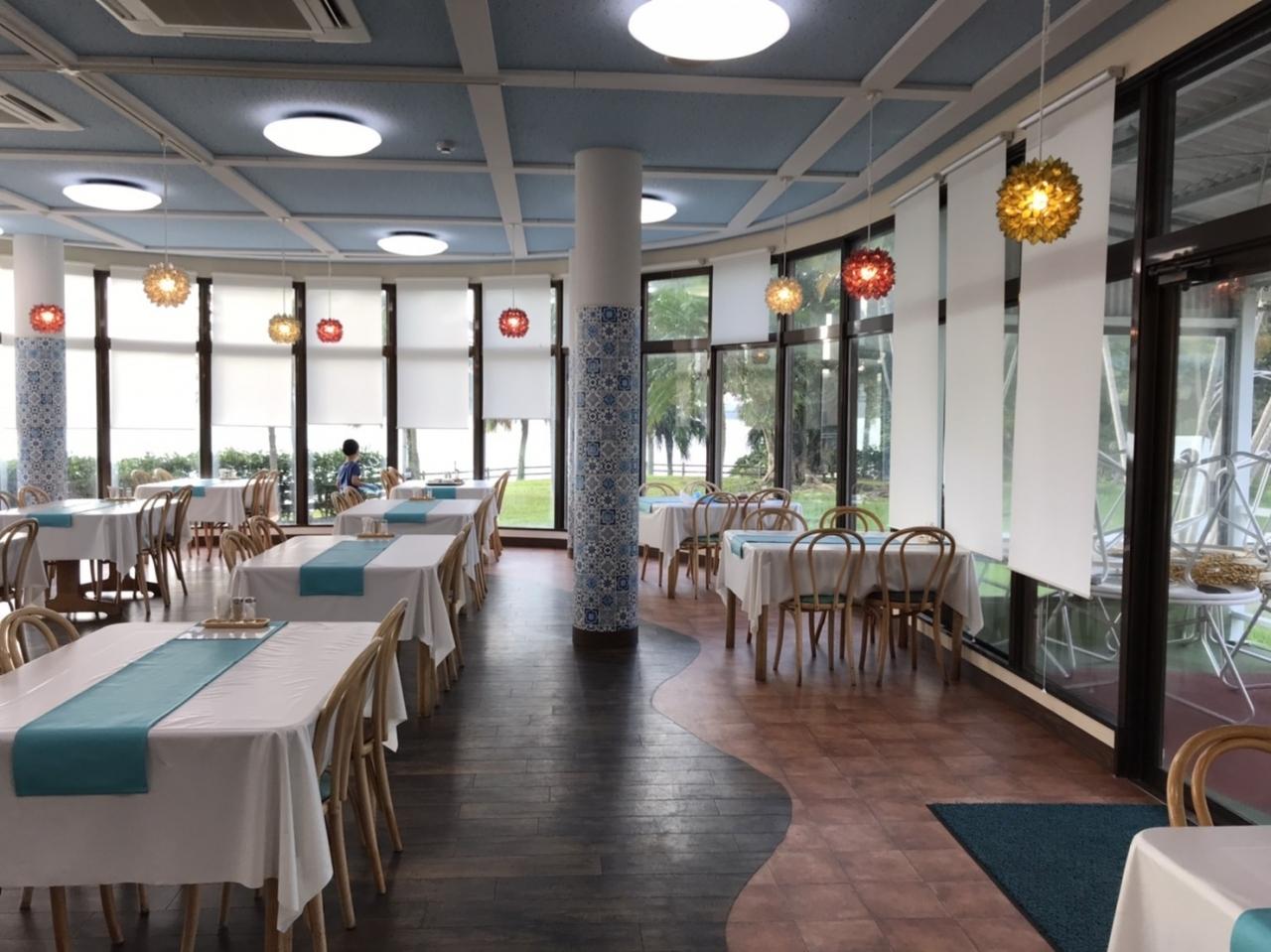 外の海とプールが見渡せる、右奥の席にしようっ♪
