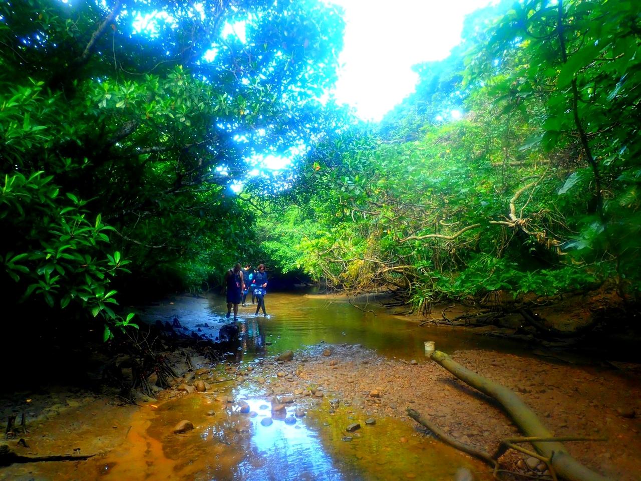 ここは中腰で歩かないと石が背中に刺さったりする。ヘッドライトもON。消すと真っ暗でコウモリもいるし、腰まで水に浸かります。鍾乳洞、楽しんだ~。次はマングローブ。