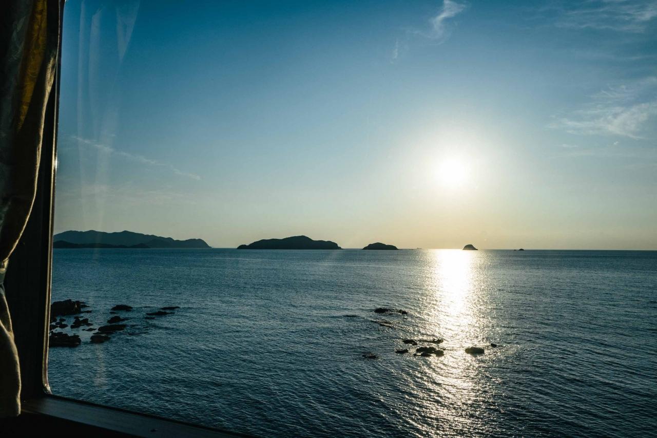 さらに、地元のみかんつかったサワーとかも飲んだりします。それにしても窓から見える風景がすごいきれいだなあ。絵画のようだ。