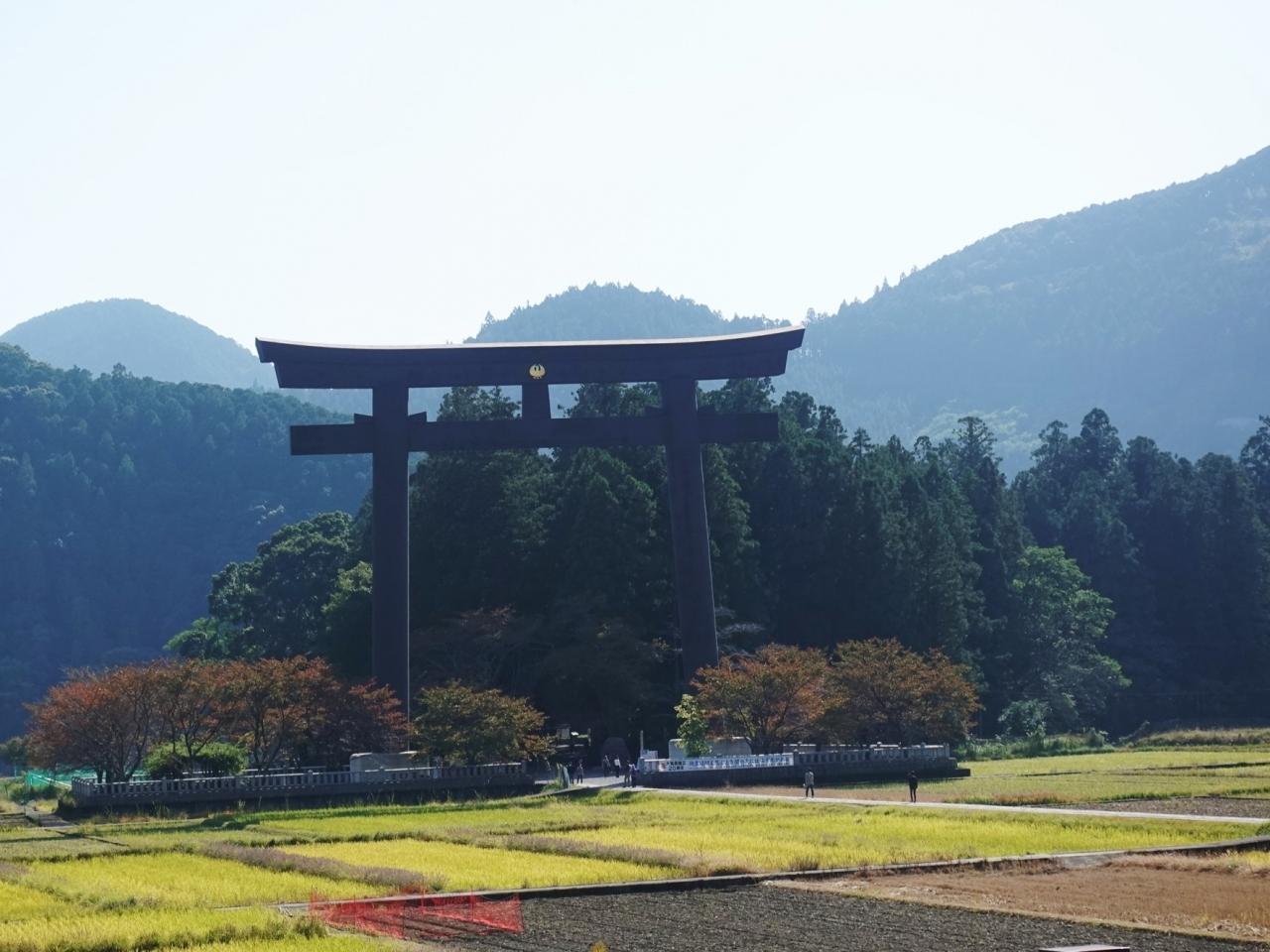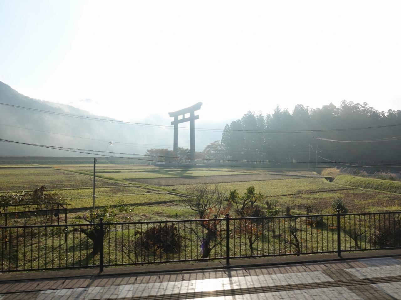 途中、朝霧の中の大斎原、大鳥居が見えました。 -