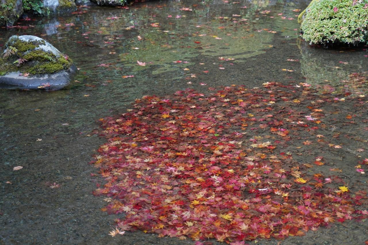 池に浮き沈みの紅葉の葉