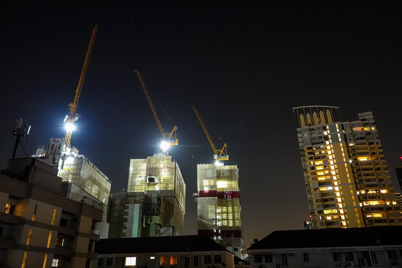 しゃぶしゃぶ食べ過ぎて、吐きそうになりながら部屋に戻ると、向かいの現場はまだ仕事中。ライトアップが綺麗だったので撮影。