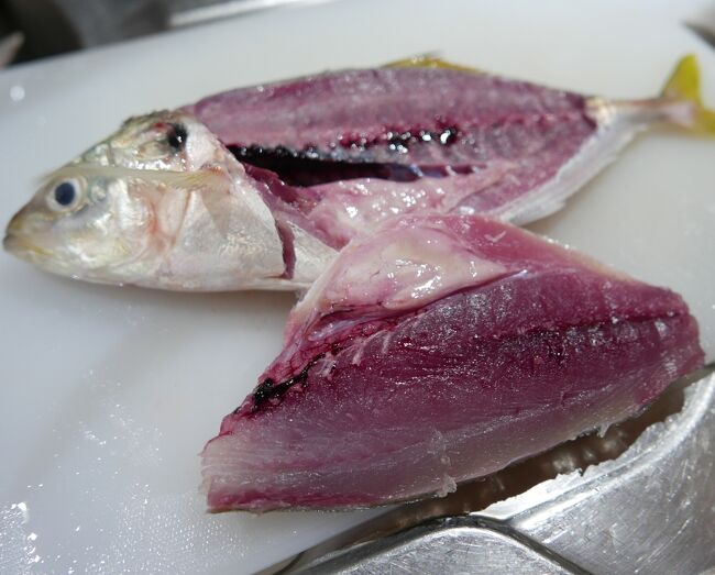 早朝ナクルアのアーモン市場で買ったアジは今晩の刺身だ。