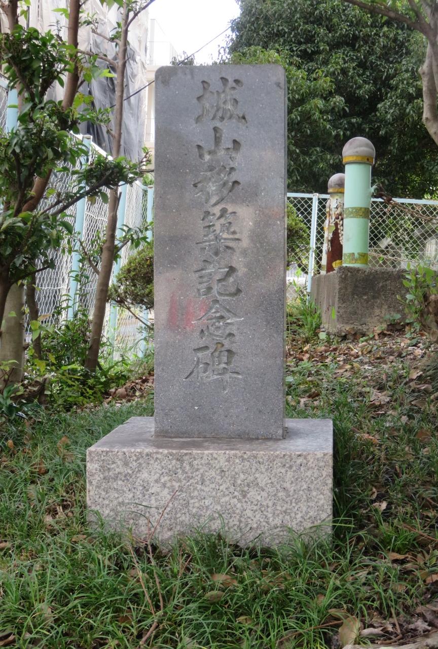 『城山移築記念碑』の文字が刻まれた、比較的新しい石票の光景です。裏面に移築のいきさつが記されていました。楽田小学校が城跡と推定され、一帯は城山という地名がついています。