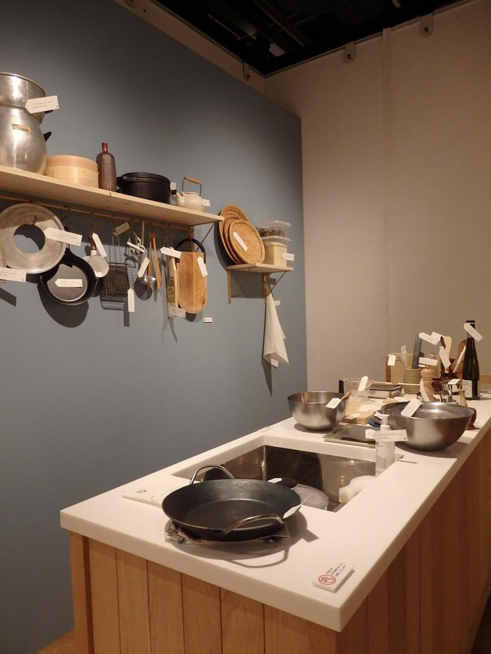 キッチンと食卓、食器棚、それぞれに広沢さん愛用の道具やお皿、オリジナルレシピなどを紹介しています。道具には一つ一つ偏愛コメントが付いています。ここにある道具を使うと料理がもっと楽しく豊かになるかもと、実際に使ってみたくなります。リーフレットをご覧いただくと、アイテムの詳細が分かるものも。食卓では、時期時季のものを使ったレシピを紹介。