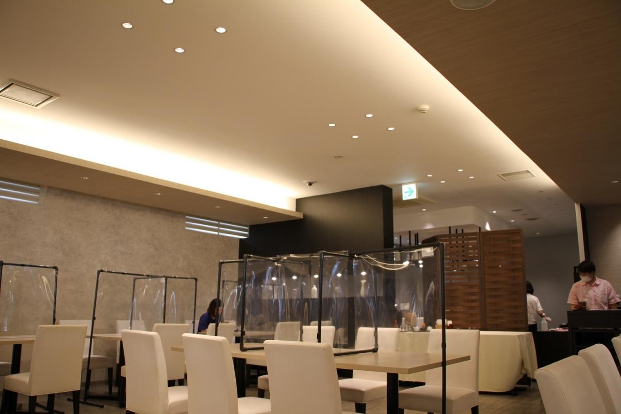 入口で検温・消毒を終えてレストラン内に入ると、2年前に宿泊した時と違って、テーブル席に仕切りが設置されたり、宿泊客が適度な間隔を保てるように工夫されたり、新型コロナ感染防止策が施されていました。