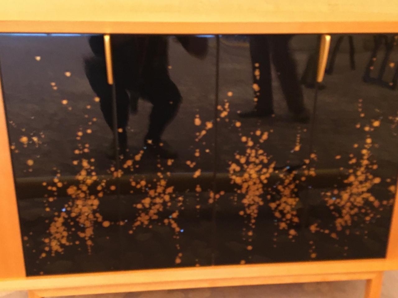 座椅子の背の部分には「五七の桐」の「蒔絵(まきえ)」が施されています。桐の葉の色は微妙に異なり、同じ模様の椅子は一つもありません。 -