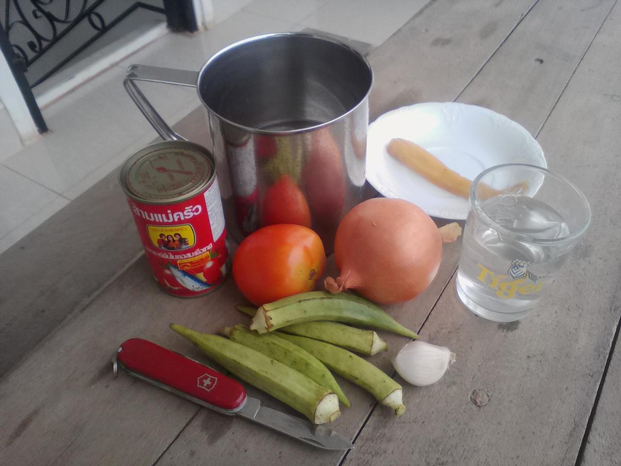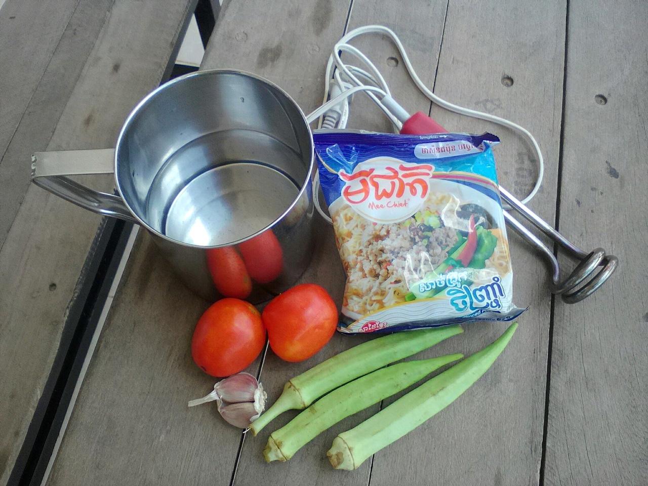 市場でトマトとオクラを購入。時価ですがこの時はこの量で1000リエル(0.25ドル)。ネギとトウガラシはサービスで付けてくれます。