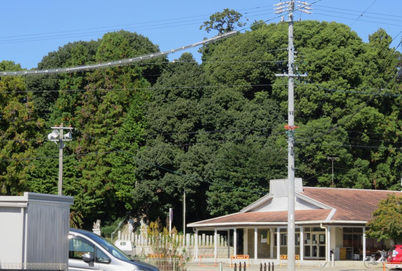 振り返って眺めた、勝手神社の『鎮守の杜』の光景です。高木はすべて常緑樹ですから、古墳の上の勝手神社が姿を見せることはないようです。『鎮守の杜』は、古神道における神奈備(かむなび、かんなび)という神が鎮座する森のことで、神代・上代(かみしろ)とも呼ばれます。