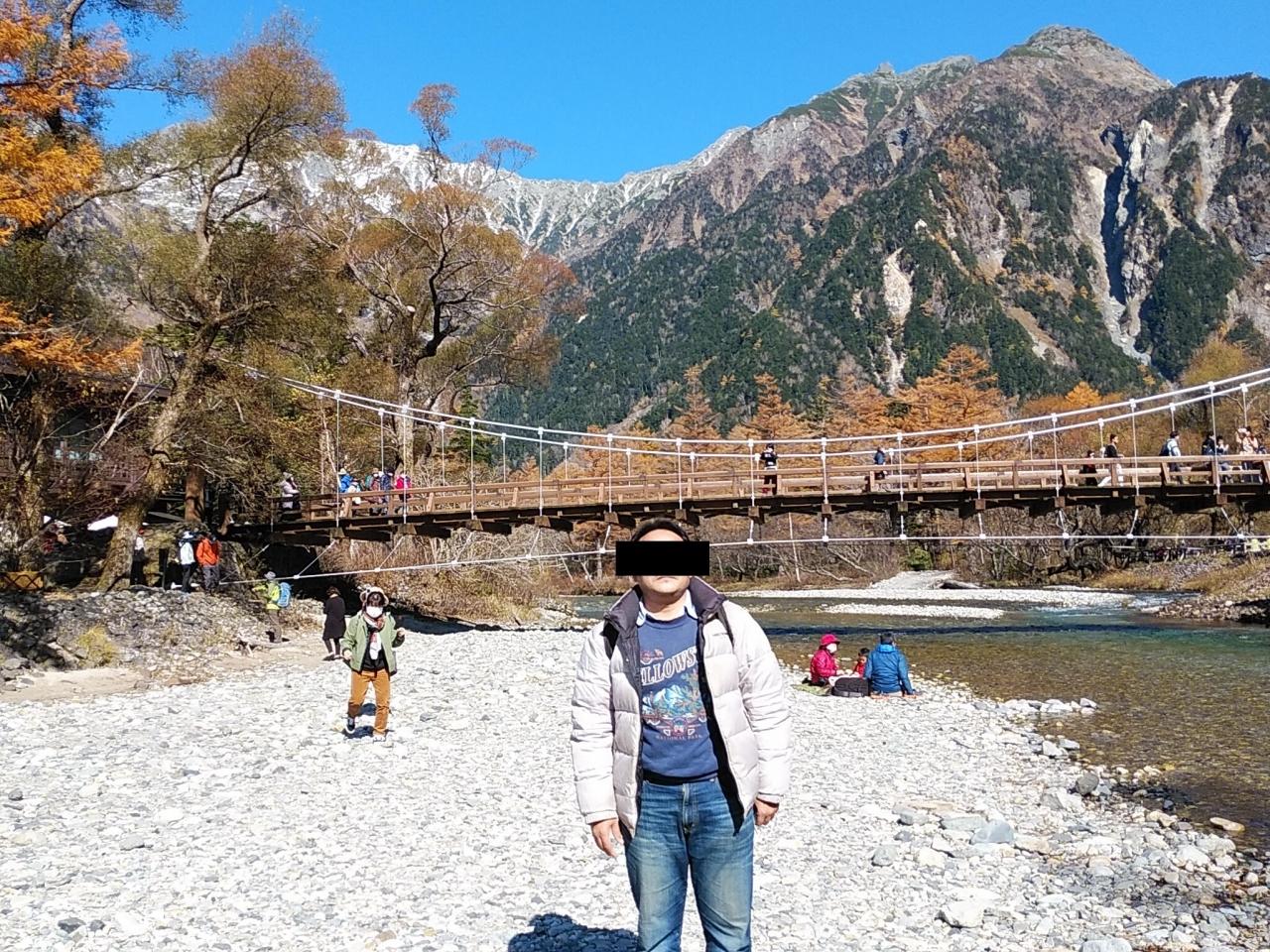 橋の右側にいます。この位置からだと左側のギザギザの西穂高岳まで見えるようになります。