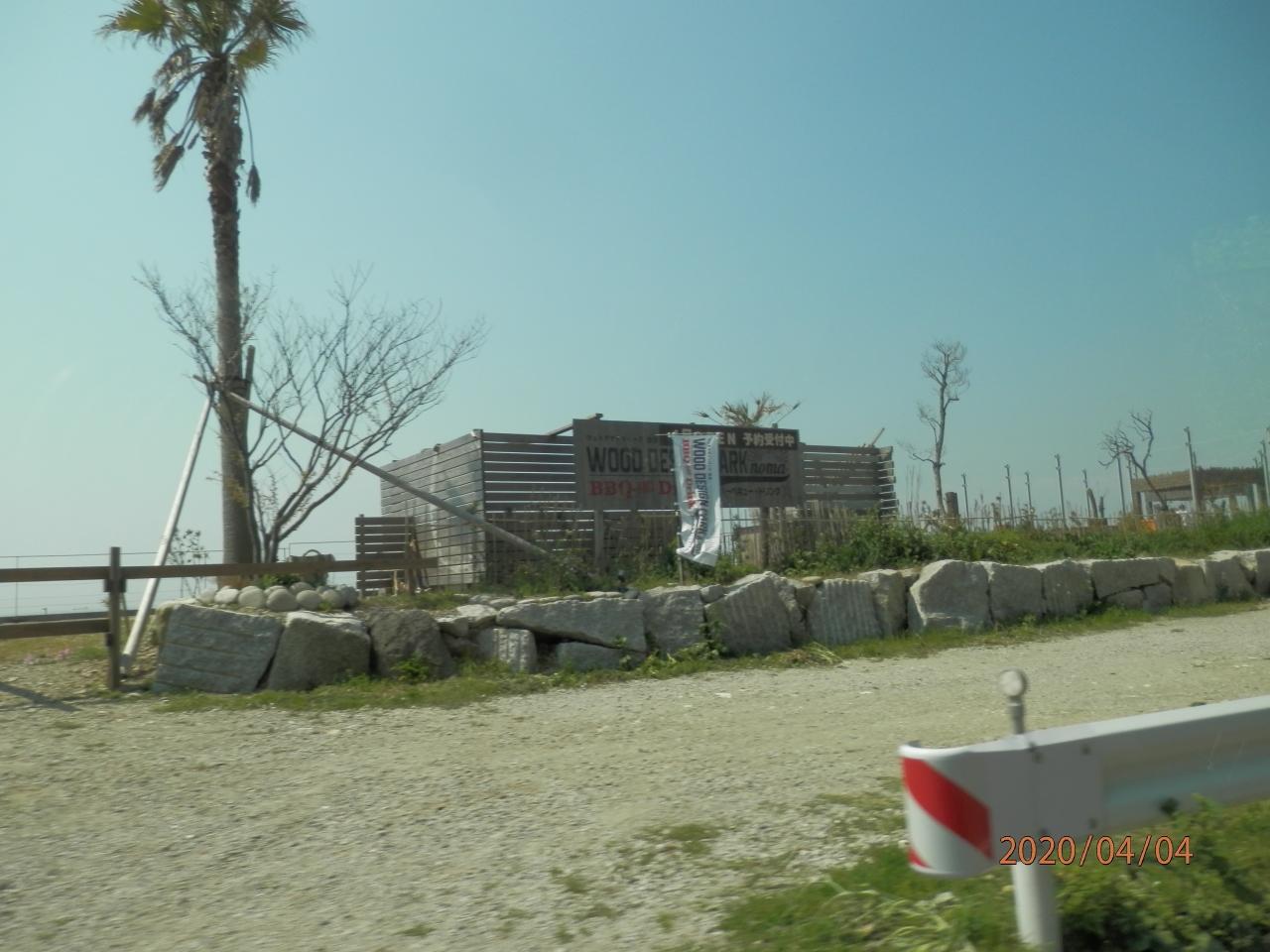 200404-1211.土曜。こちらの看板は WOOD DESIGN PARK noma BBQ DRINK 。別の看板には 灯台と海が見える Cafe BBQ ウッドデザインパーク とあります。