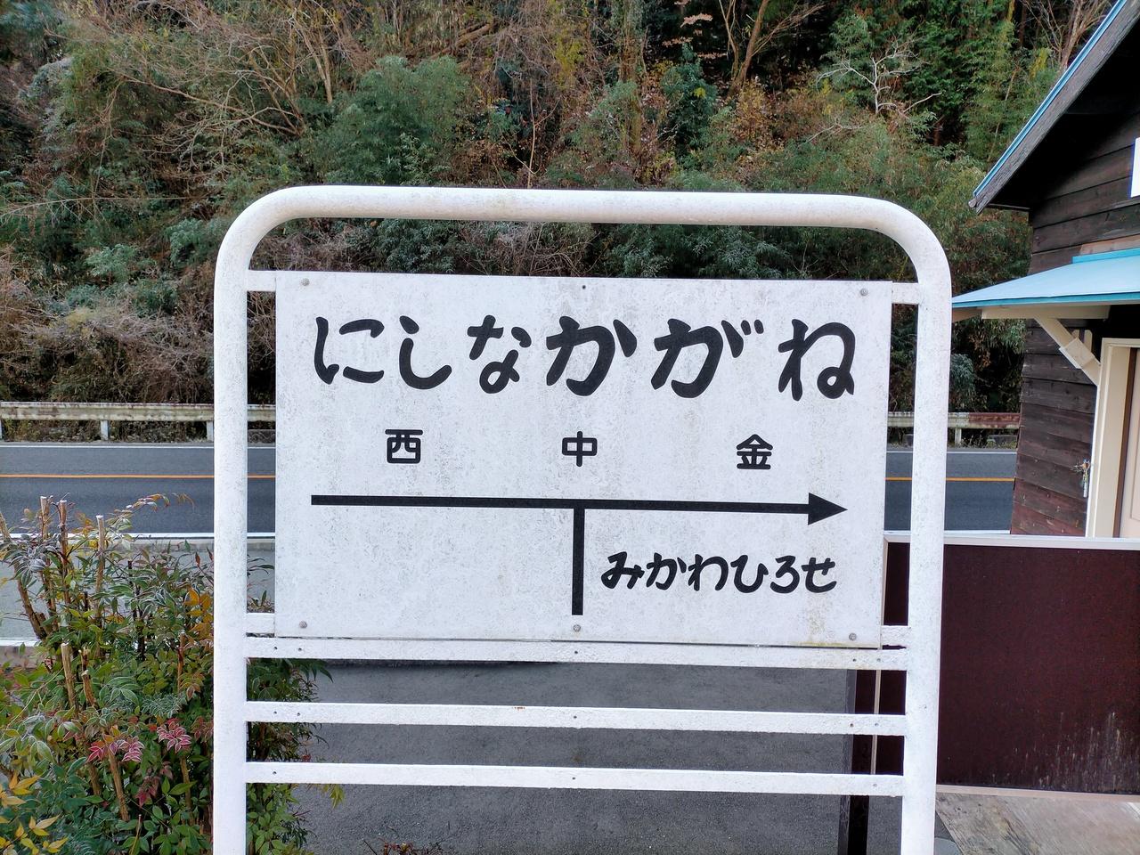レンタカーを走らせること30分。名鉄・三河線旧「西中金」駅へ。駅名標は当時のまま。