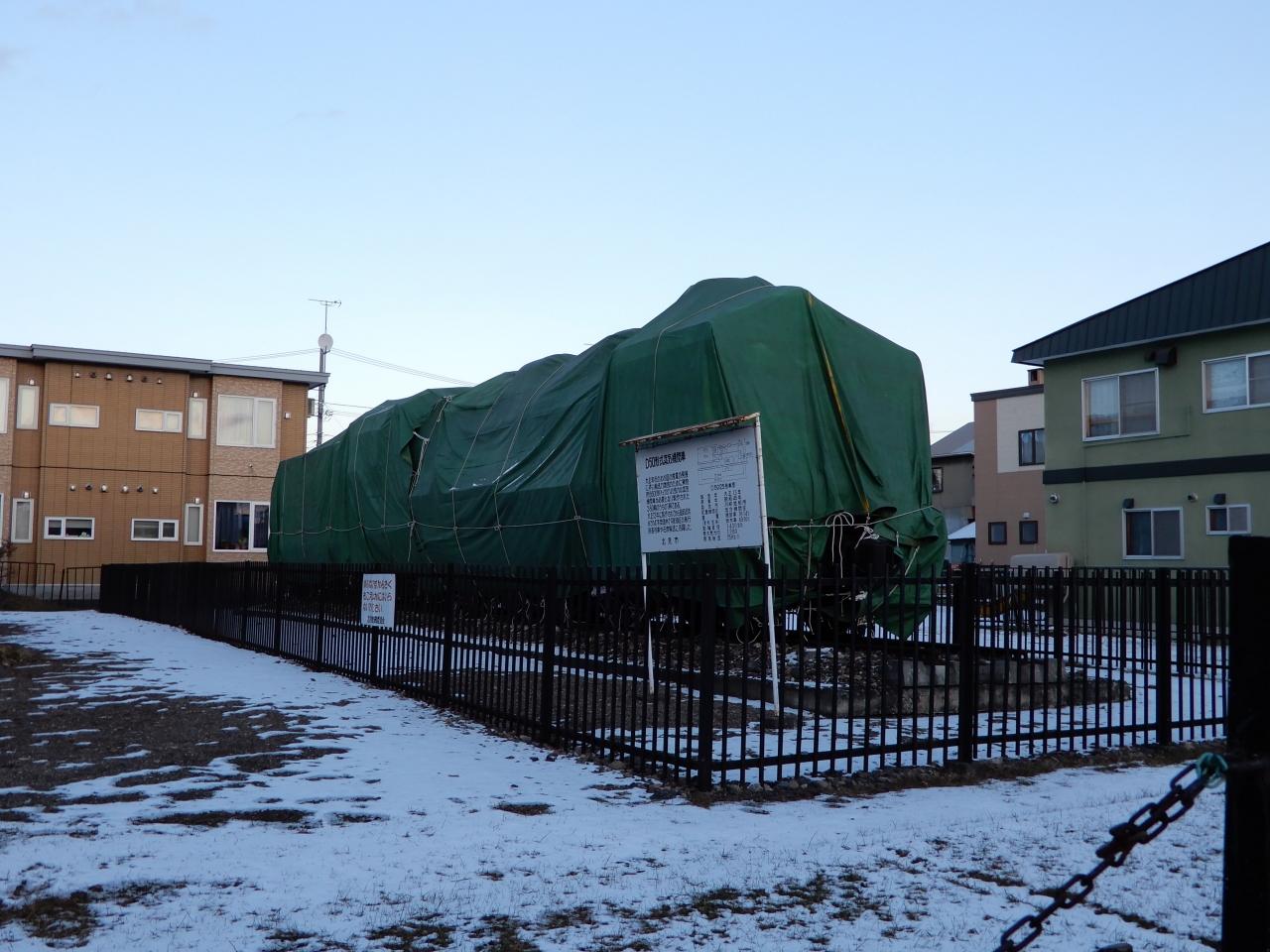 前の画像の左横に、公園があり、蒸気機関車が展示されているとのことですが、冬囲いされており、見ことはできませんでした。