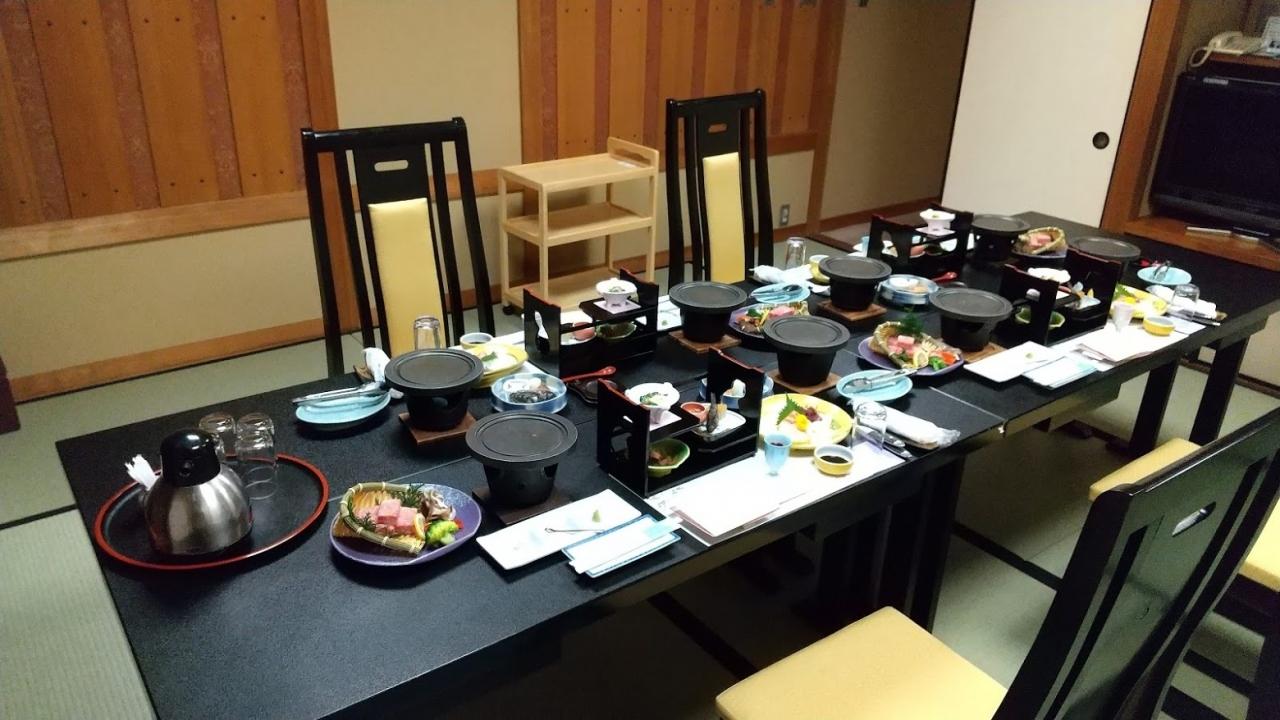 19時、夕食は、但馬牛とアワビのステーキコースだった。隣の507号室にテーブルを入れて食事の準備がされていた。この部屋も12.5畳の正方形だったが、長いテーブルが入っているせいか、狭く感じたし、正方形ではなく、テーブルの長手方向が長いように感じた。鮑は少し小ぶりだったが、柔らかくてうまかった。但馬牛はとても柔らかいが、脂が多すぎてもっと噛み応えのある赤身の方がよかった。
