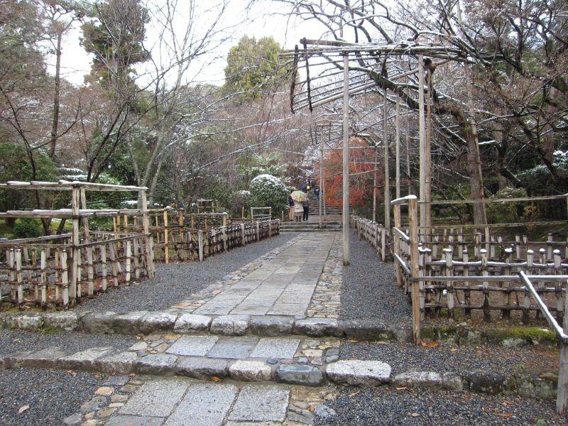 最後に階段を登っていきます。道の両側に広がっている仕切りのようなものは龍安寺垣という垣根だそうです。壁のようになっているところは竹をひし形に組み合わせてあるとのことです。
