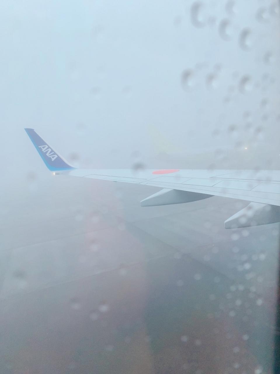 ちなみに、熊本空港離陸前はこんな感じで霧が濃くて周りが何も見えない。 こんな状況でも飛行機って飛べるんだね! ちなみにこの写真、よーく見ると私が乗っているANA機の向こうに、ソラシドエアの飛行機が停まってるんですよ! 言われてみれば、うっすらと黄緑色の尾翼が見えるような見えないような…。