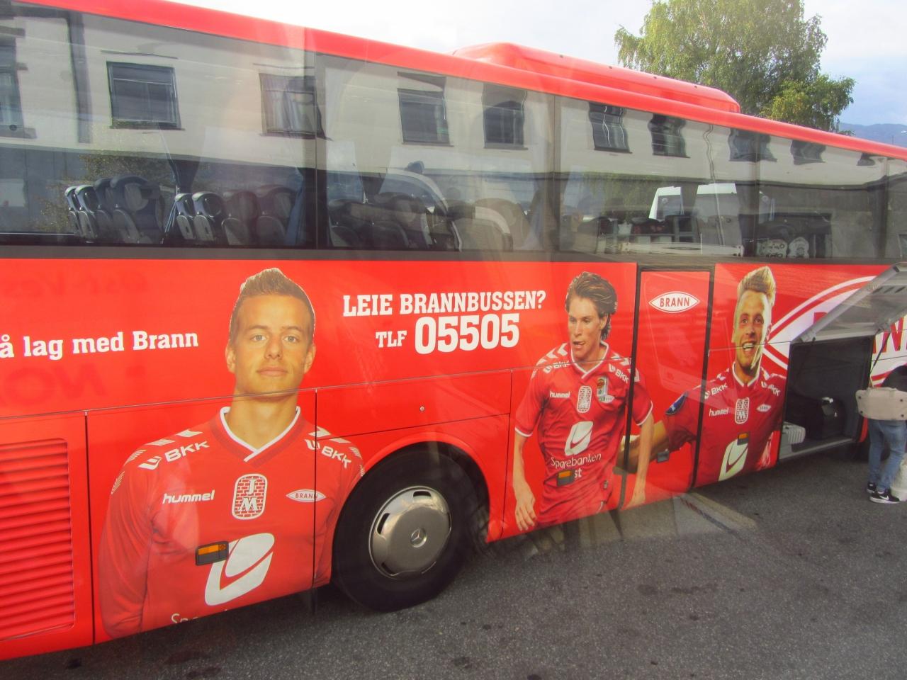 グドヴァンゲン行きのバスに乗りました。隣のバスは、サッカー.チームのサポート.カーでしょうか。車体に「消防バスを借りる?」と書いてあります。