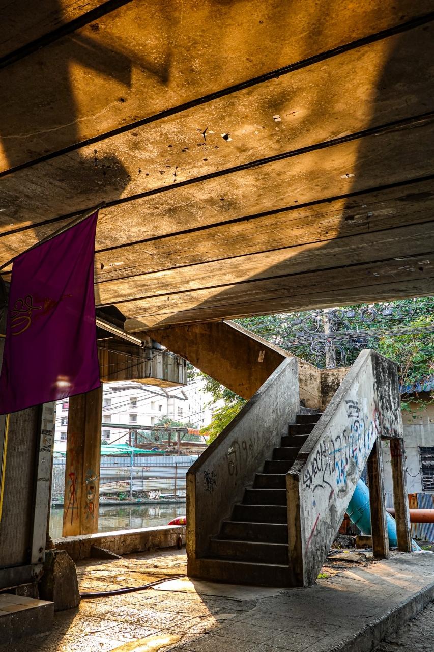 むき出しの配線が気になる軒先を歩いて橋の下へ