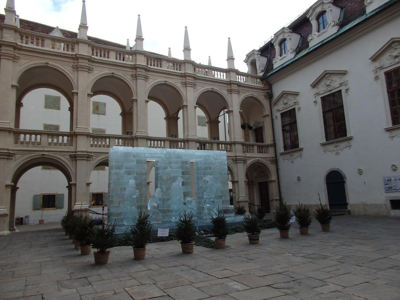 ルネッサンス様式の美しいアーチが重なる中庭で、Eiskrippe Graz が設置されています。