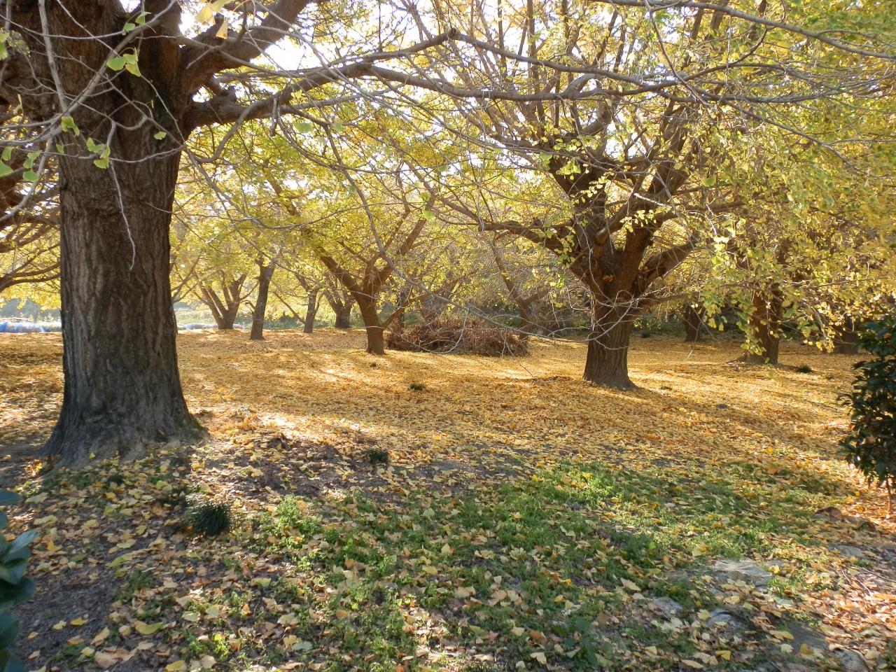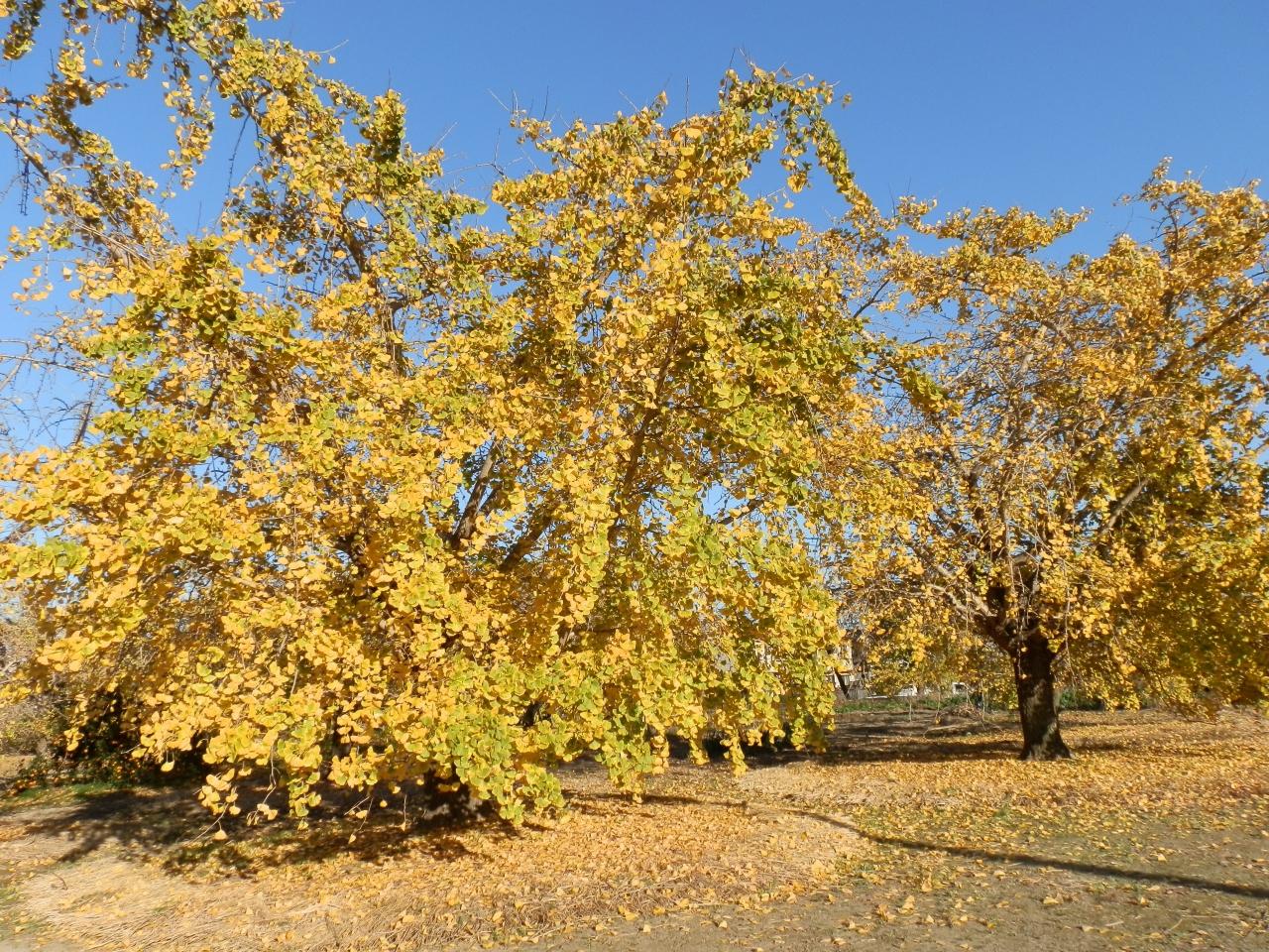 路地裏に入るとイチョウ畑です。街路樹のイチョウ並木と違って、枝は自由に四方八方に伸び、背は低い。銀杏の収穫を考えての栽培だと思いました。