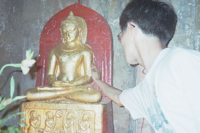 内部の仏像に金箔を貼る