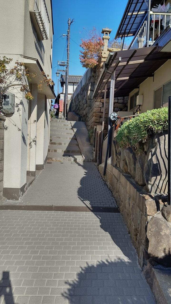 細い家の間を1分ほど歩いたら ある建物に