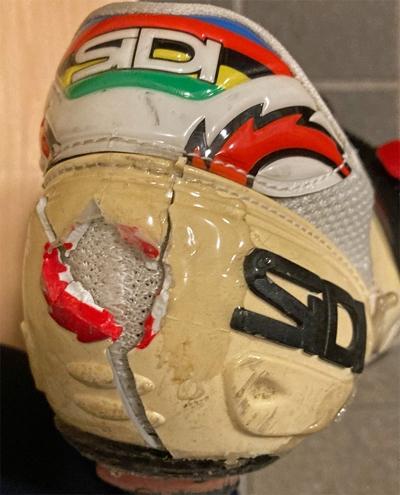ペダリングの際、力が入らないと思って、帰宅してからよく見ましたら、サイクリング専用の靴(シディ:イタリア製)のカカトが割れておりました。