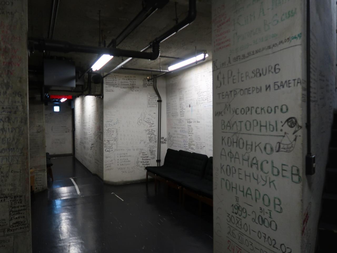 上手側舞台袖、壁の至る所にアーティストのサインで埋め尽くされている。