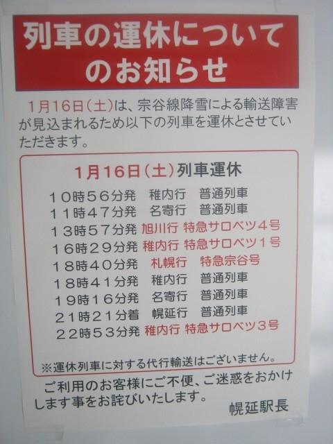 まあ、私としては、元々同じはまなすちゃん利用で稚内即折りカエルし予定でしたので、滞在先が約20分の稚内か、約2時間の幌延か、の違いになっただけ、で、タイムスケジュール的には何ら支障がないのですが、結局、はまなすちゃん運行は今回のSPきっぷ利用時にはこれが最後となってしまいました(SPきっぷの有効期限は翌日まででしたが、翌日は稚内発旅程での運行スケジュールだったのに、この時点で旭川以南にはまなすちゃんが滞留ということが決まってしまっているので、翌々日の札幌発運行に備えて、17日は旭川か札幌で足止めだったと思われます)ので、最北の街稚内にて、冬のはまなすちゃんを撮れなかったのがちょっと心残りかな…。