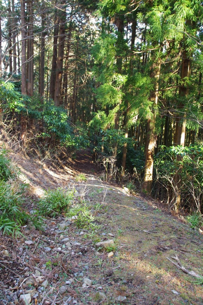 スマホでの地図を見て、麓に下る細い道に入りました。緩やかに下っていると、2頭の鹿が走り去り、速かった。この道は枯れ葉等に覆われていましたが、コンクリートの舗装、縁石、石積みが有り、手厚い整備がされていました。旧道なのでしょう。