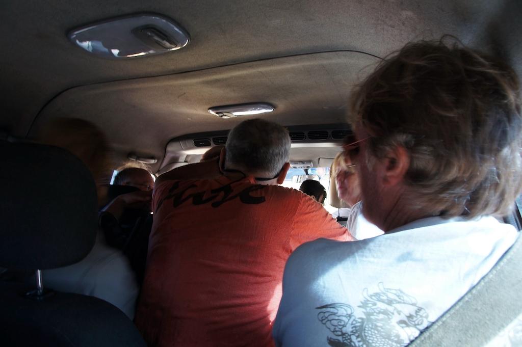 欧米人の持つ大きめのバックパックは車の上に載せられるが、ほこりまみれになるので、自分の分は死守して、車内に持ち込んだ